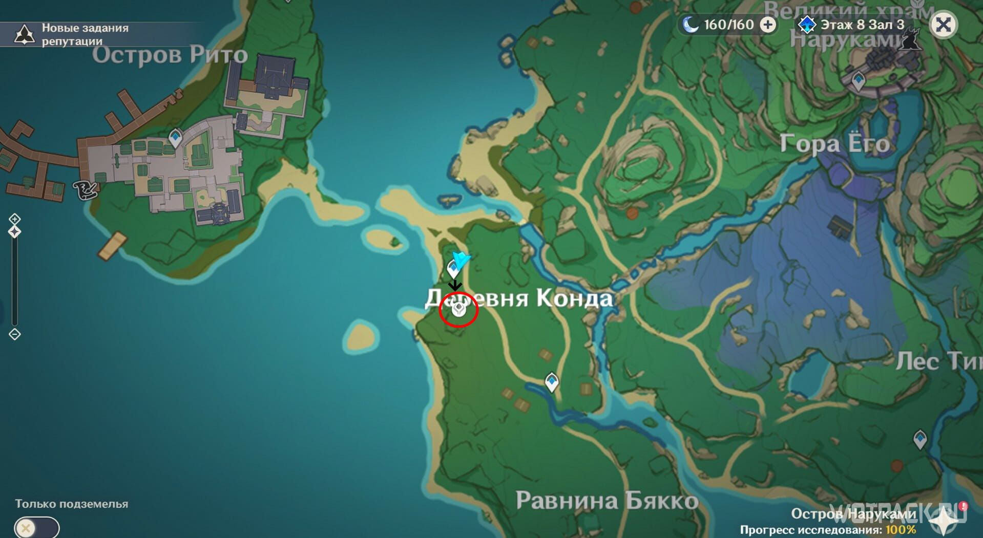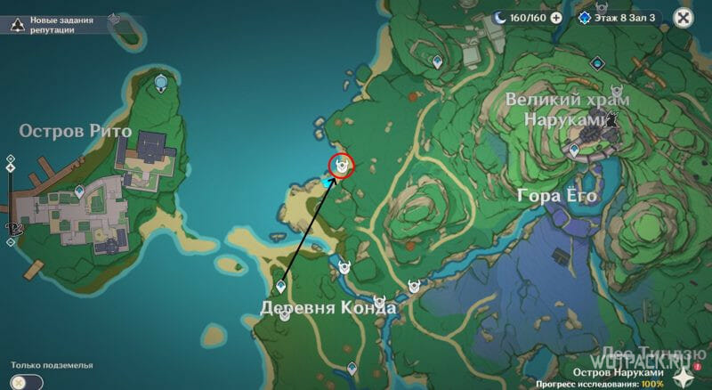 От имения Камисато двигайтесь на северо-восточный берег к якорной стоянке.