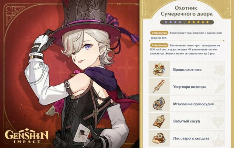 Охотник Сумеречного двора в Genshin Impact – сет 4 и 5⭐ артефактов из Фонтейна, подходящий для персонажей, чей уровень HP постоянно меняется во время боя под влиянием навыков. Данный набор повышает урон обычной и заряженной атаки, а также увеличивает шанс крит. попадания.