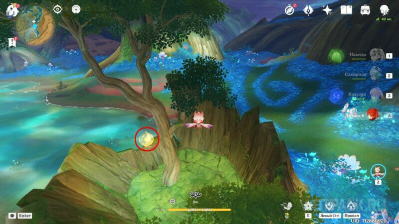 Испытание на время предлагает пролететь по витиеватой линии в сторону статуи Дендро Архонта Оазиса Вурукаша. Не советуем вставать дальше указанной точки, поскольку иначе в конце может разорваться связь с Соруш.