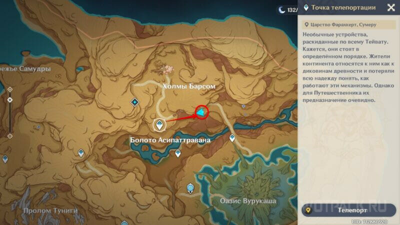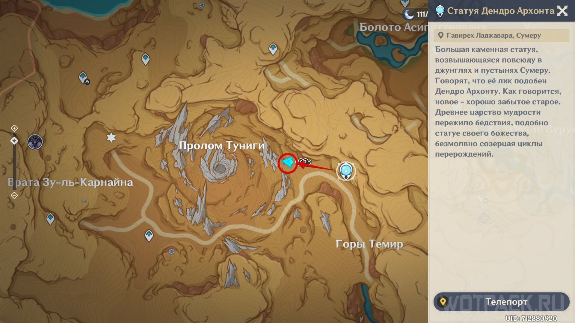 Добраться до следующего фрагмента можно от статуи Дендро Архонта в Оазисе Вурукаша или телепорта северо-восточнее Пролома Туниги. Когда окажетесь на пересечении троп от каждой из данных путевых точек, двигайтесь мимо хиличурлов в третий проем на юг, где на стенах сверху увидите пару фруктов ниродха. Выбравшись на открытое пространство, заметите фрагмент.