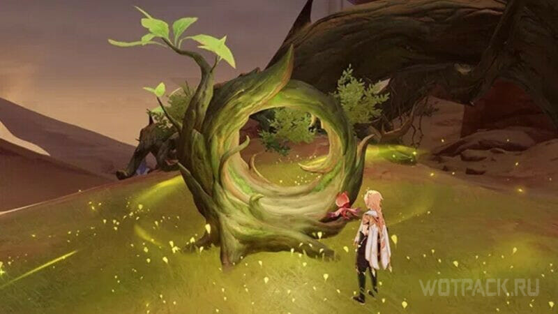 Юго-восточнее статуи Дендро Архонта в Оазисе Вурукаша можно обнаружить оперенье внутри верха огромной коряги на западе области.