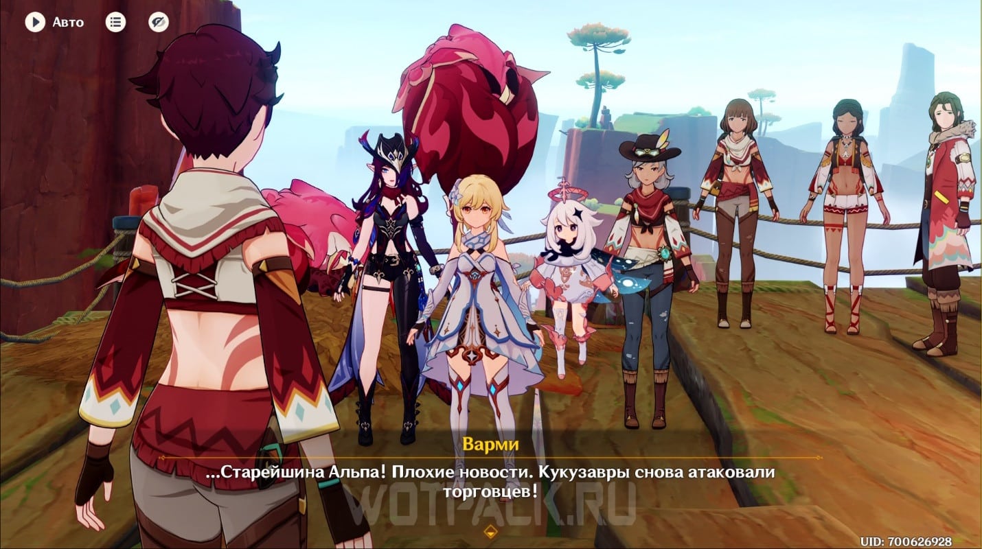 Пострадавшие торговцы находятся чуть дальше по дороге на запад, недалеко от статуи Архонта. Доберитесь до места и вмешайтесь в противостояние людей и агрессивного завриана. Выяснится, что нападающий — это «сестра» Часки.