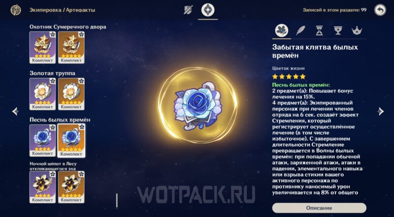 Песнь былых времен в Genshin Impact — комплект 4-5⭐ артефактов из региона Фонтейн. Половина сета обладает универсальным для целителей бонусом лечения, а полный набор позволяет лекарю выступить в качестве баффера. Комплект предъявляет высокие требования к количеству исцеления и ротации в команде.
