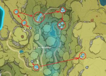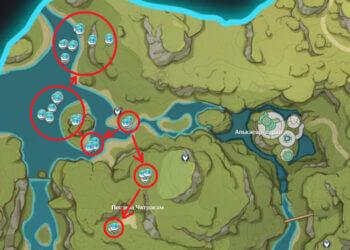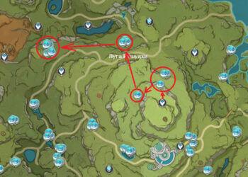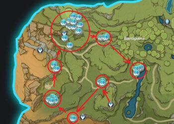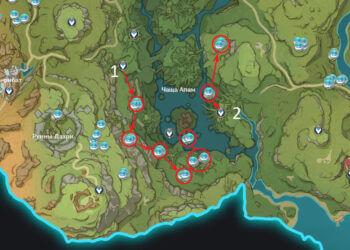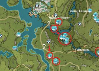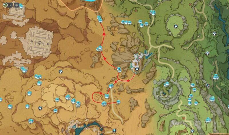 В Ущелье Чинват есть 2 маршрута и 1 скопление. Переместитесь к телепорту рядом с Городом Сумеру и от него двигайтесь к Гандархве. Оттуда телепортируйтесь на запад и идите на юг. В конце отправляйтесь к Статуе Архонта под Склоном Гандха.