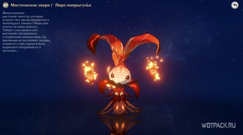 Попрыгунья, использующая стихию огня. Встречается в Мондштадте, Ли Юэ и Инадзуме. Запускает в игрока огненные шары, которые поджигают траву и существ с Дендро статусом, накладывают Пиро статус.