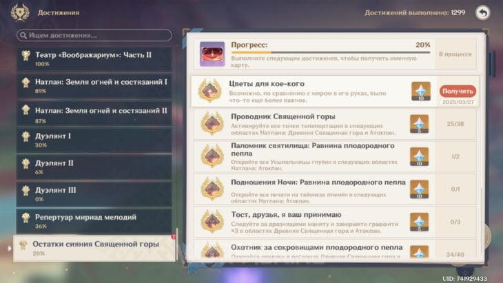 Завершение задания до 29 июля 2025 года позволит забрать дополнительную награду в виде 100 примогемов во вкладке события «Священная гора и благодатные земли».