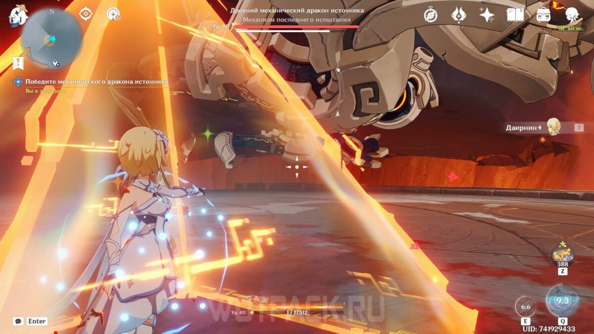 После спасения Путешественника сражение с Древним механическим драконом источника продолжится. Совместно с заврианом атакуйте противника и следите за выполнением им особых атак. Когда получаете предупреждение от Паймон или видите, как время замедляется, активируйте специальный навык спутника. Также его можно использовать, когда враг заключает героя в клетку.