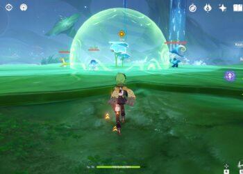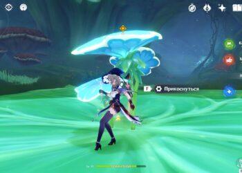 Выходите к арене с Дендро куполом посередине. Разберитесь с охраняющей его живностью, после чего защита спадет и можно дотронуться до голубых цветков (клавиша «F» по умолчанию). Они материализуют платформы, а игровая камера любезно их покажет.