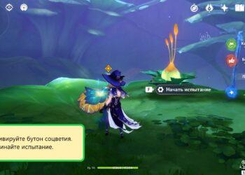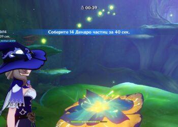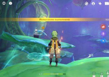Прыгайте на пружинистом грибе до платформ и пройдите по ним. На выступе в конце пути будет бутон соцветия и активатор испытания на время. Примените Дендро к бутону и вызовите четырехлистные символы, после чего активируйте испытание и соберите 14 частиц за 40 секунд, пользуясь символами для перемещения. Успешное завершение снимет Дендро купол, под которым еще одни голубые цветки и обычный сундук.