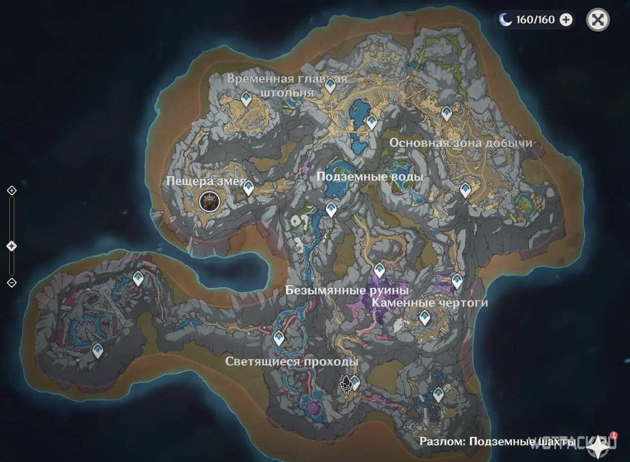Найти Разлом можно на западе от Ли Юэ. Его территория разделена на 2 части: карьер и подземная шахта, которая реализована отдельно, по типу Энканомии.