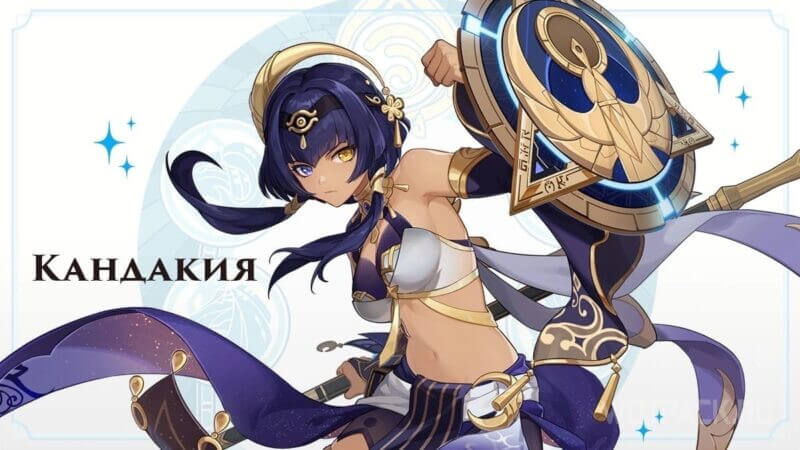 - Кандакия – загадочная Гидро копейщица. Она сможет совершать рывки, баффать здоровье союзников через Ешку и ставить щиты. Кандакия будет вешать на врагов статус, снижающий их дамаг, а также скорость передвижения и атаки.
