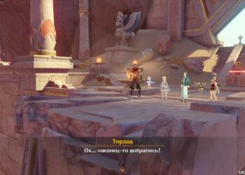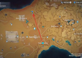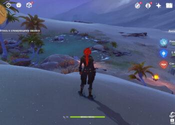 Направляйтесь к следующему оазису, расположенному на востоке от дюны Пиршеств. От Оазиса Собека двигайтесь на север, мимо Статуи Дендро Архонта. Приблизьтесь к водоему, после чего начнется кат-сцена, в которой отряд разобьет лагерь.