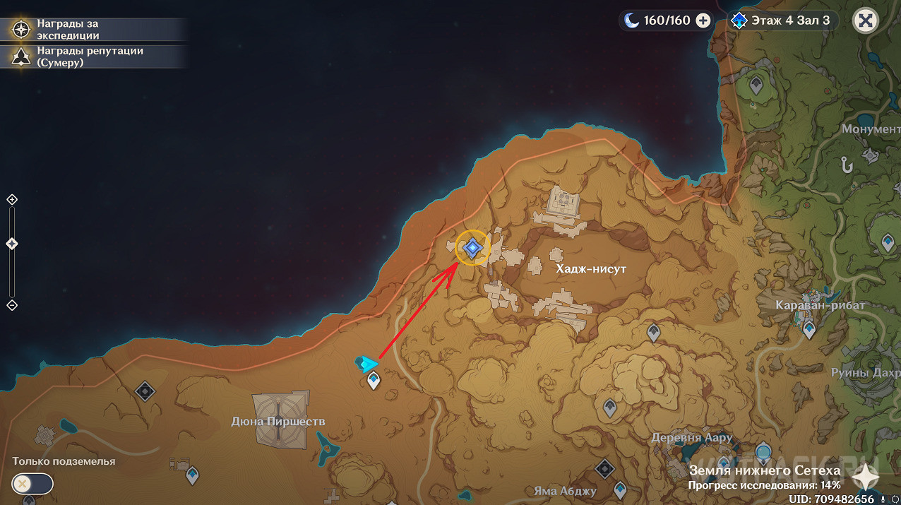 Отдохнув, отправляйтесь в Хадж-нисут, расположенный на северо-востоке от лагеря у оазиса. Войдя в область поиска, найдите Хадж-нисут. Двигайтесь в сторону углубления.