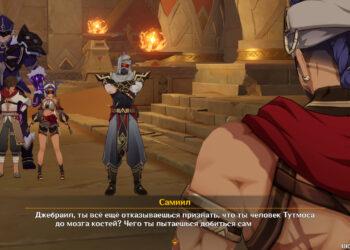 Оказавшись на последнем этаже, подойдите к трону. Отряд начнет обсуждать дальнейшие действия и все заметят, что Джехт пропала. Обернувшись, друзья увидят Самиила, Пустынника и Фатуи. Враг снова начнет давить на отряд и говорить про тайну храма, а в итоге Джебраил расскажет банде Тутмоса молитву. Самиил сядет на трон и погибнет, а оставшиеся члены группировки вступят в бой.