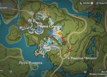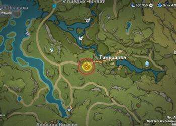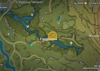 От города Сумеру по тропе идите к западному входу в Гандхарву. Когда подойдете к показанному на скриншоте месту, начнется кат-сцена, в которой Путешественника окликнет наемник Пустынников. Бандитов сюда направил Дотторе.