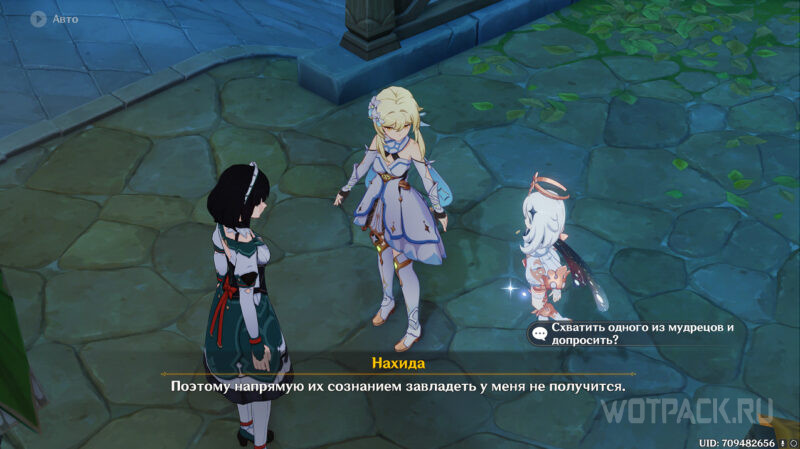 Дождавшись нужного времени, отправляйтесь на рынок и реализуйте план Нахиды. В первую очередь подойдите к гадалке, чтобы начать кат-сцену. Архонт поможет Путешественнику вселиться в сознание Набии: необходимо выбирать реплики, чтобы воздействовать на Сетарию.