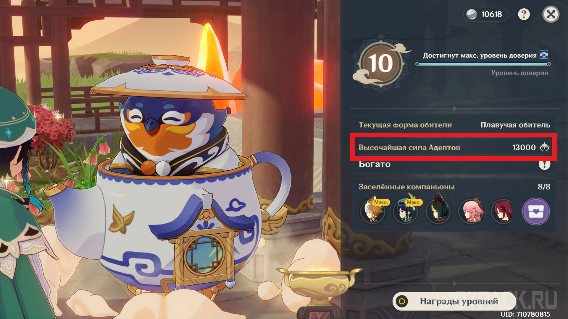 Текущее количество силы Адептов можно также узнать из меню Уровня доверия либо вверху экрана при входе в Чайник. Этот показатель напрямую зависит от обустройства обители снаружи и внутри дома.