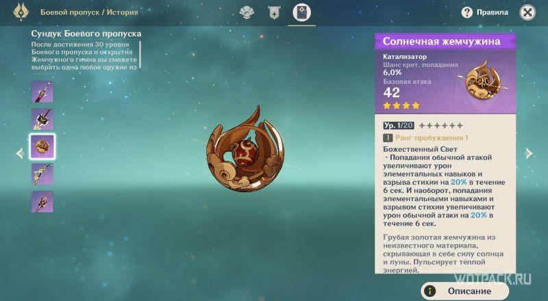 Солнечная жемчужина в Genshin Impact – 4⭐️ катализатор из Боевого Пропуска, приобретающийся за донат. В данном гайде рассмотрим его характеристики, необходимые материалы для прокачки, а также узнаем, каким персонажам он подойдет.