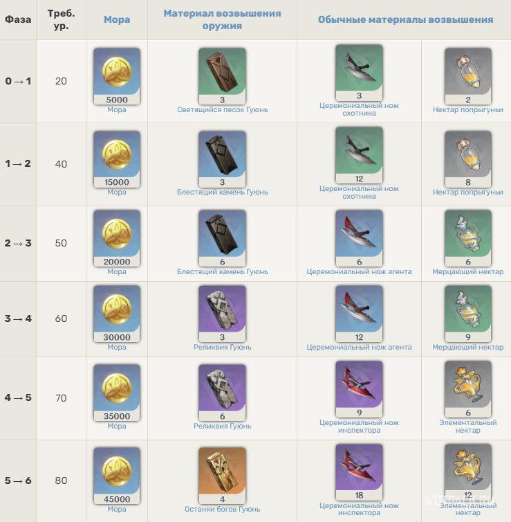 В таблице ниже указаны необходимые материалы для возвышения оружия: