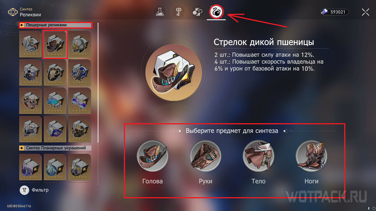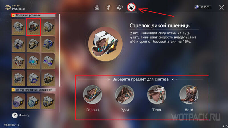 Альтернативный способ, как получить сет Стрелок дикой пшеницы – воспользоваться синтезом реликвий. В меню перейдите в раздел «Синтез», затем откройте крайнюю справа вкладку и в списке «Пещерные реликвии» найдите нужный набор реликвий, чтобы из Обломков создать интересующий предмет.
