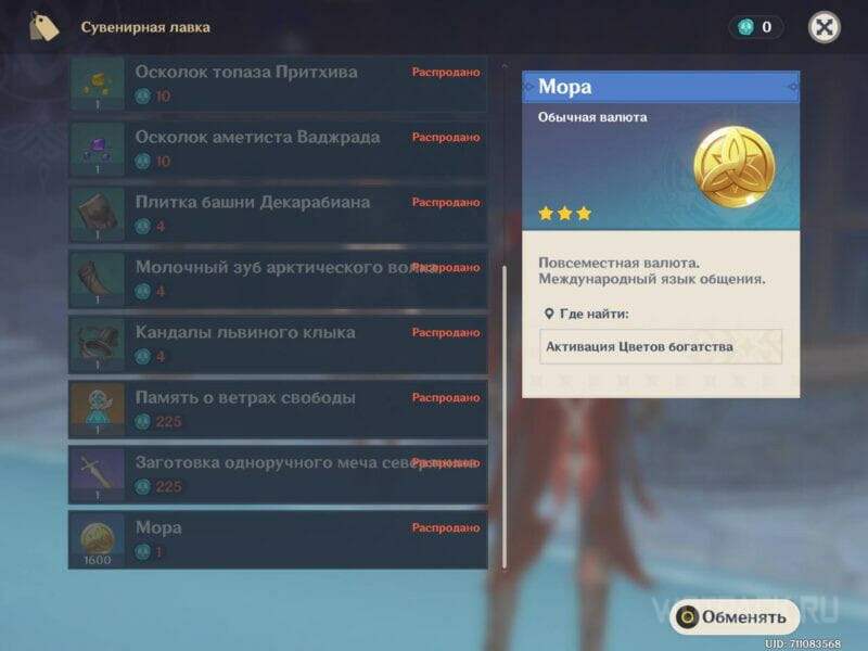 Товары приобретаются за Печати Анемо, которые можно получить за исследование Мондштадта. Когда весь ассортимент будет скуплен, а Печати останутся, можно обменивать по 1600 Моры на 2 Печати.
