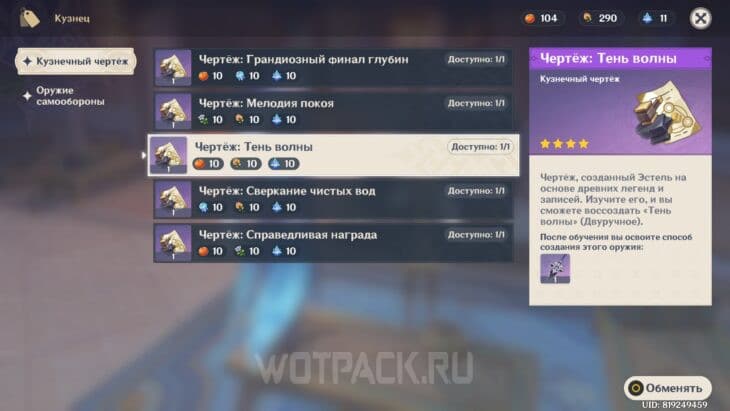 Тень волны можно получить только через систему крафта оружия. Для этого нужно не только собрать все необходимые материалы, но и обзавестись чертежом, который продается у кузнеца в Фонтейне за особые диковинки: