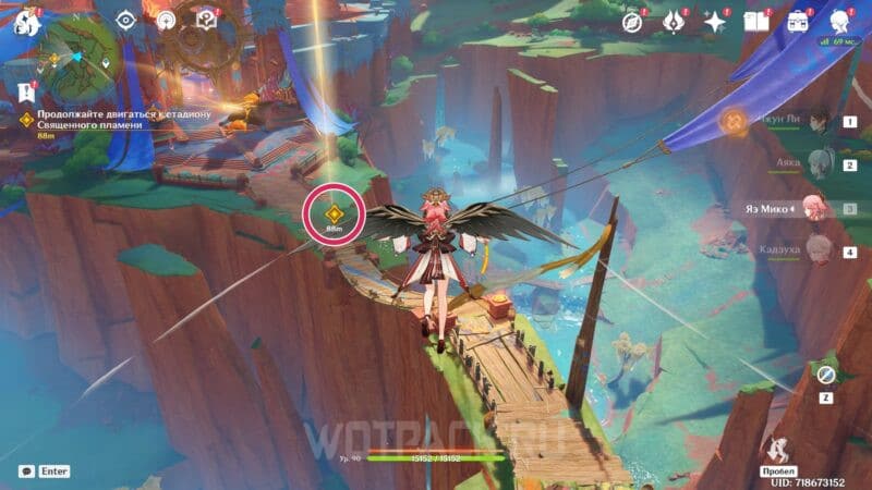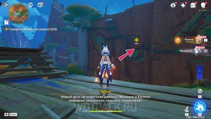 - Идите к краю площадки и обнаружите следующую подсказку — взберитесь на стену с помощью элементального навыка Качины и войдите в яркий разлом. Бегите на запад, пока не заметите нужный постамент. Получите последнюю искру, сразившись с соперниками поблизости.