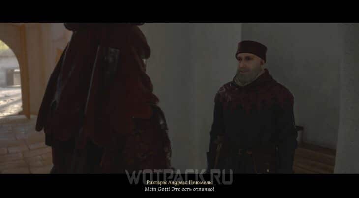 Минуйте коридор и, оказавшись на заднем дворе, поднимайтесь на второй этаж по лестнице. Там найдете рихтаржа Андреаса Плюмеля, с ним и нужно поговорить.