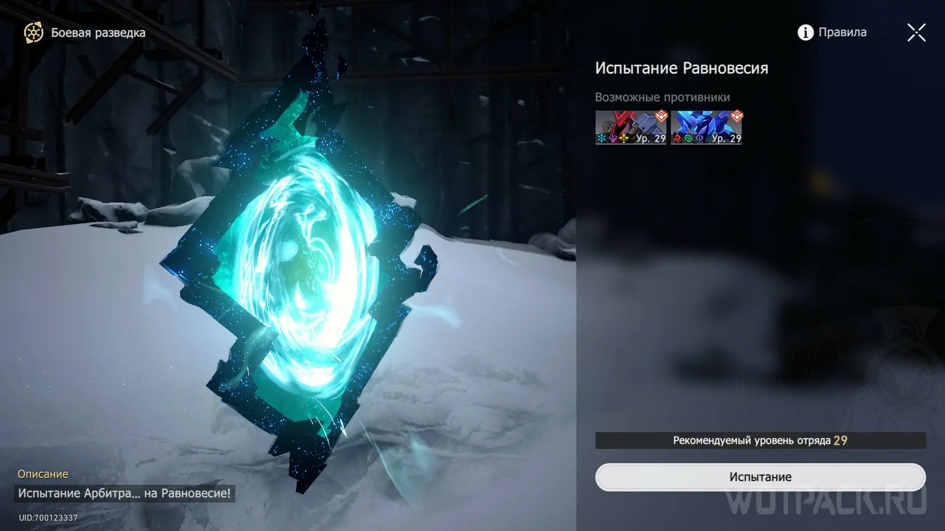 Когда телепортируетесь в указанную маркером на карте область, увидите восьмиконечную звезду, парящую в воздухе. С приближением она раскроется в портал, пройдя в который можно выполнить Испытание Равновесия. В интерфейсе Боевой разведки сможете увидеть возможных противников и рекомендуемый уровень отряда, чтобы подготовиться к сражению и пройти его для возвышения мира.