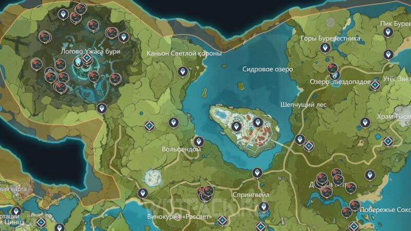 Карта ветряных астр показывает, что наибольшее количество цветов растет в Долине Ветров и Логове Ужаса Бури. Кроме этого несколько диковинок можно собрать у Винокурни «Рассвет» и Озера Звездопадов. Всего в Мондштадте находится 73 ветряные астры. Далее представим маршруты фарма и подробное расположение цветов в Анемо регионе.