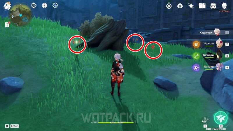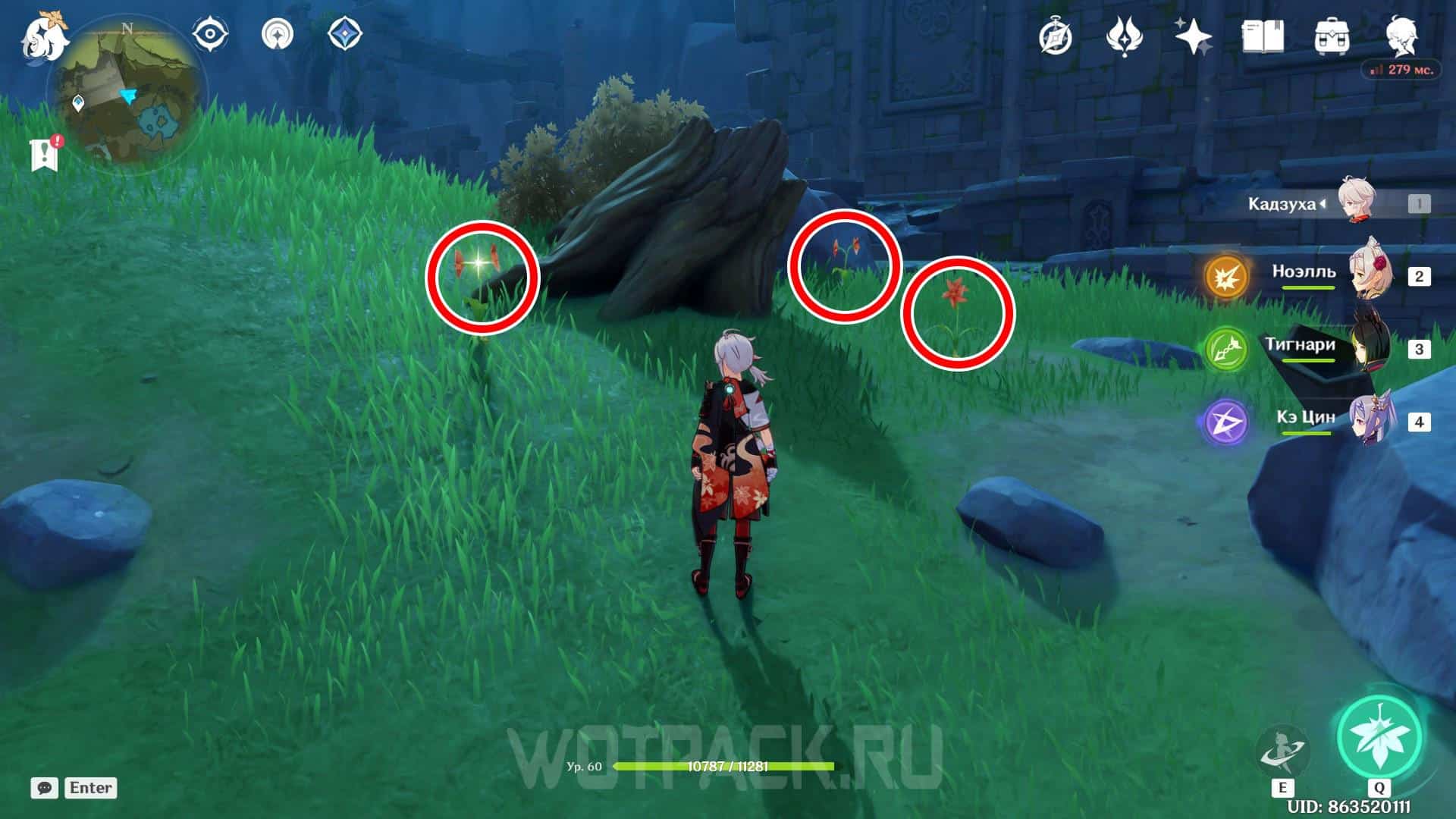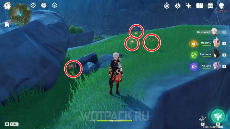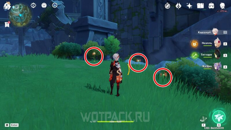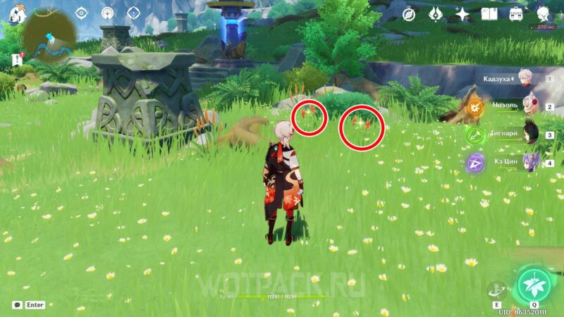 Развернитесь на северо-восток и двигайтесь в указанном направлении, чтобы сорвать 2 цветка около лагеря хиличурлов.