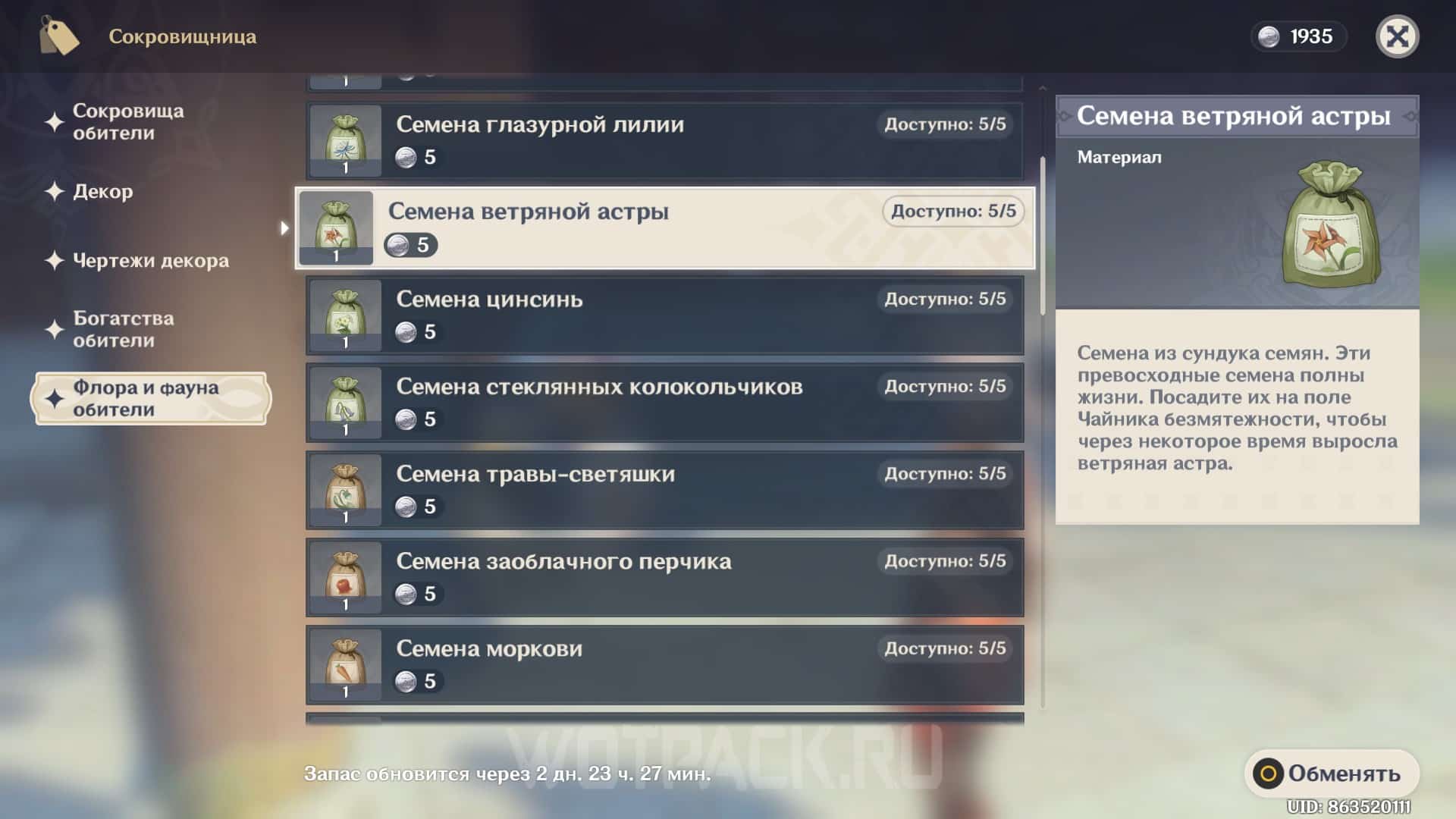 Еще одним вариантом получения ветряных астр является выращивание их в Чайнике безмятежности. Чтобы это сделать, сначала необходимо получить семена ветряной астры. Они покупаются в Сокровищнице у Пухляша или добываются с помощью Сундука семян, который экипируется во время сбора цветов на местности.