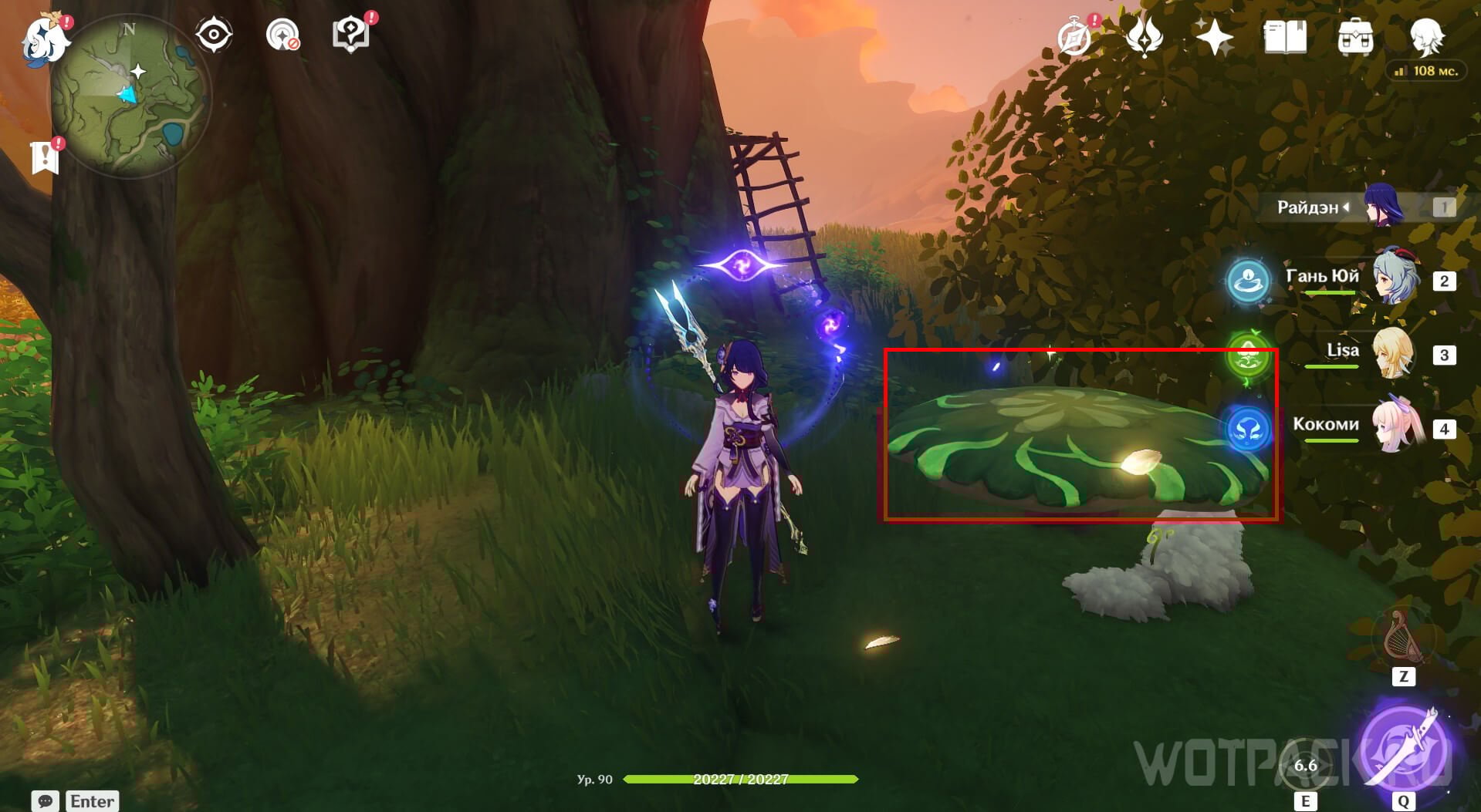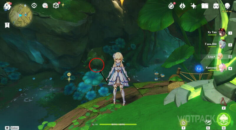 Сразу за домиком предыдущей точки небольшой пруд с плесенниками. Победите их и подойдите к зверьку, который сидит на кувшинке. Затем примените на него Дендро элемент.