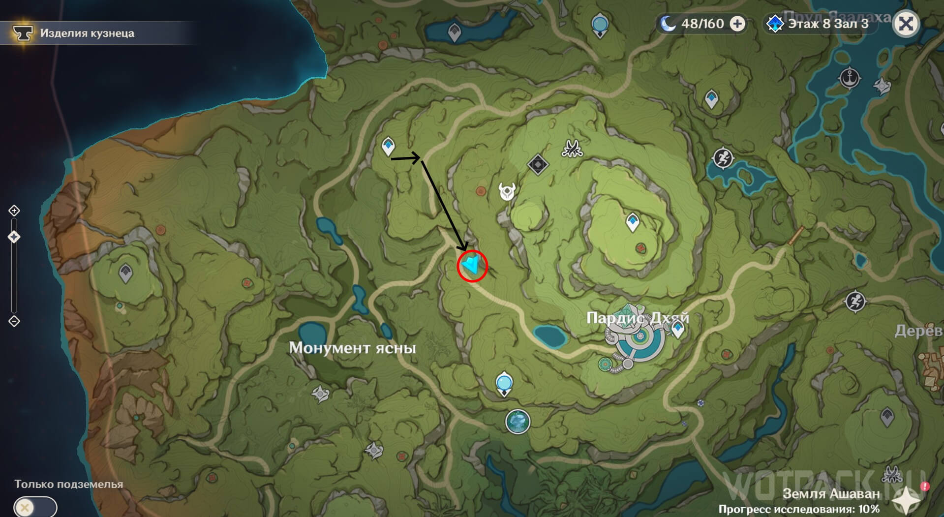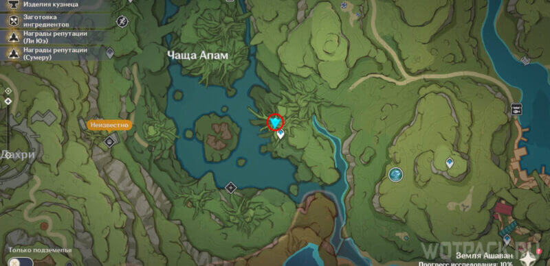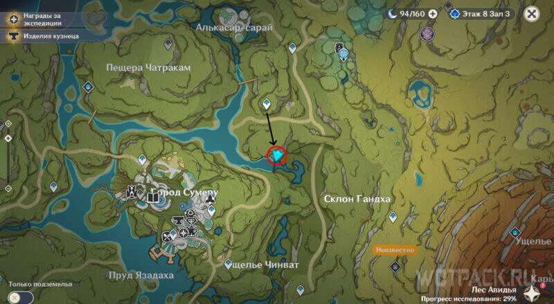 Находится в пещере, вход в которую указан на карте (если не разблокирован телепорт). Не спускаясь глубже в пещеру двигайтесь от путевой точки на северо-запад (по левой стороне платформы) в тоннель с Гидро плесенниками. Сразу за ними домик, в котором медитирует аранар. Примените к нему Дендро элемент.