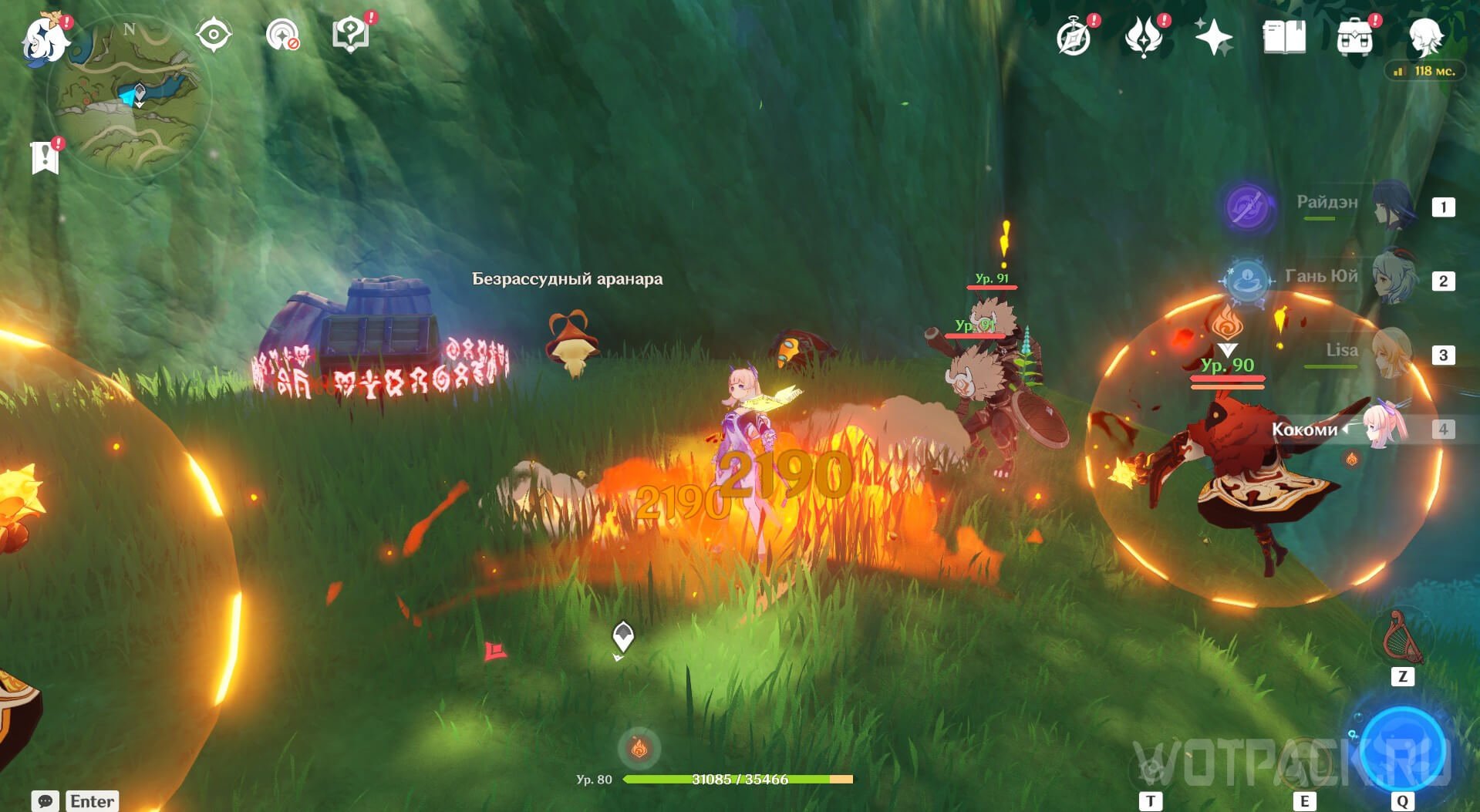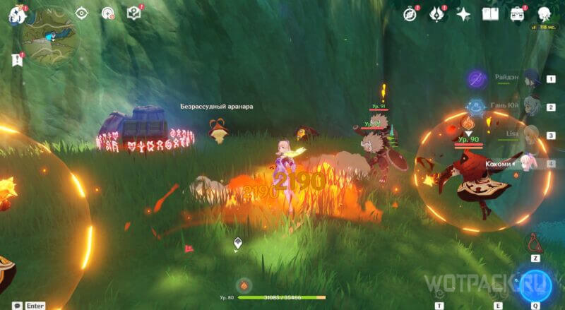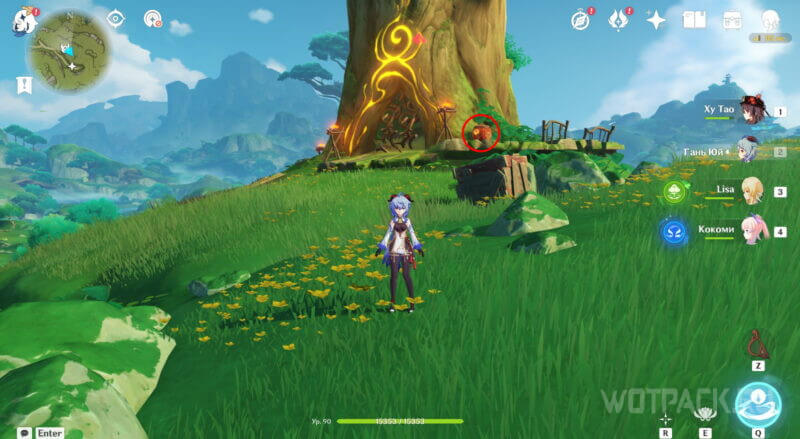 От предыдущей точки летите ко второй, северо-западной якорной стоянке. Аранара стоит за большим бревном в окружении хиличурлов. Победите врагов.