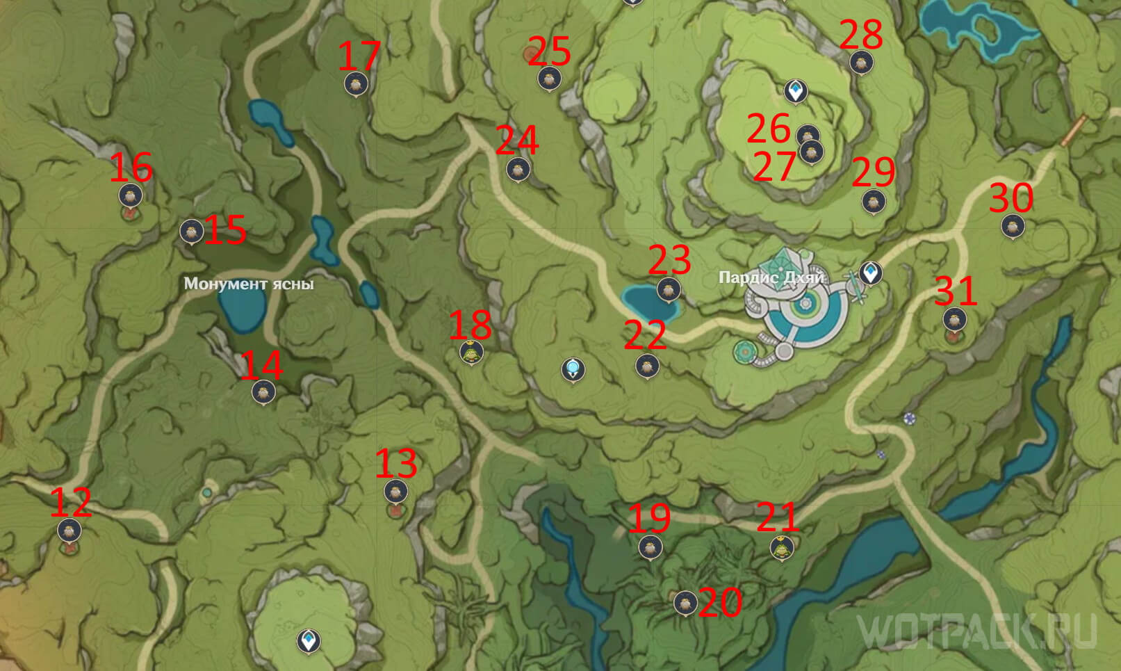 В локациях Монумент ясны, Пардис Дхяй, Руины Дахри и Чаща Апам скрывается 30 Аранар. На карте выше указано расположение каждого, далее рассмотрим их по отдельности и решение загадок.