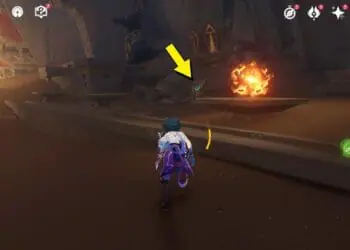 У поворота перед развилкой дороги рядом с одной из скал найдете разрушаемую груду камней. Используйте атаки, наносящие физический или Гео урон, чтобы разрушить преграду и найти первую в локации скрижаль.