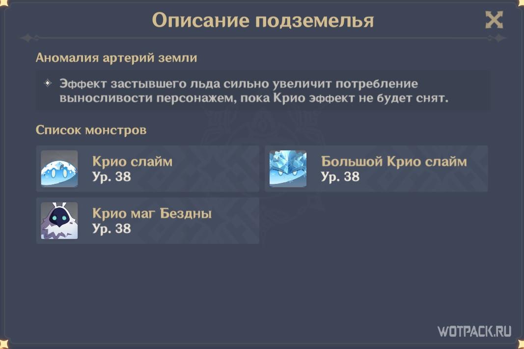 Аномалия артерий земли – эффект застывшего льда сильно увеличит потребление выносливости персонажем, пока Крио эффект не будет снят. На 3 и 4 уровне подземелья вдобавок падают сосульки, наносящие Крио урон по площади.