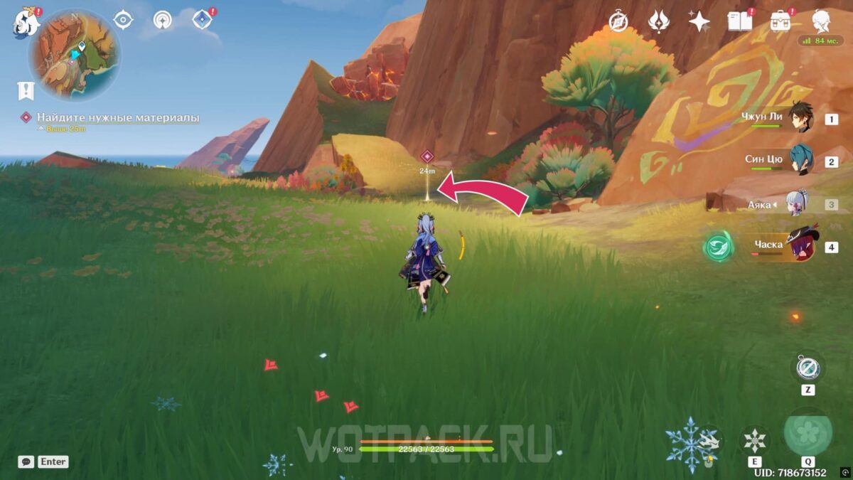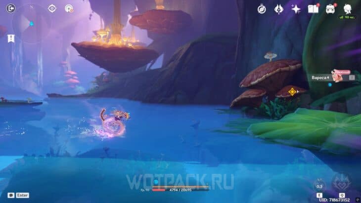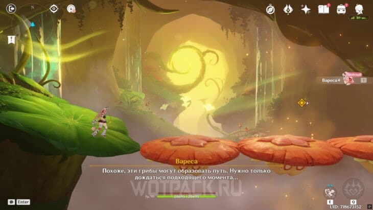 Бегите вперед по двухмерной пещере и перепрыгивайте с листа на лист. Можете удерживать кнопку элементального навыка и ускорения, чтобы Вареса перемещалась быстрее. Обычными атаками или этим же кувырком разбейте камни, чтобы проложить мосты.