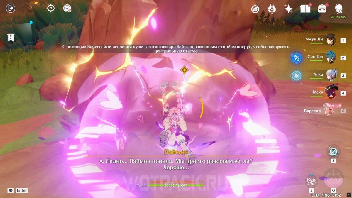 Чтобы победить монстра, сначала активируйте навыки саппортов, наложив различные баффы или щиты. После переключитесь на Варесу, прожимайте элементальную способность и базовую атаку, нанося урон в падении.