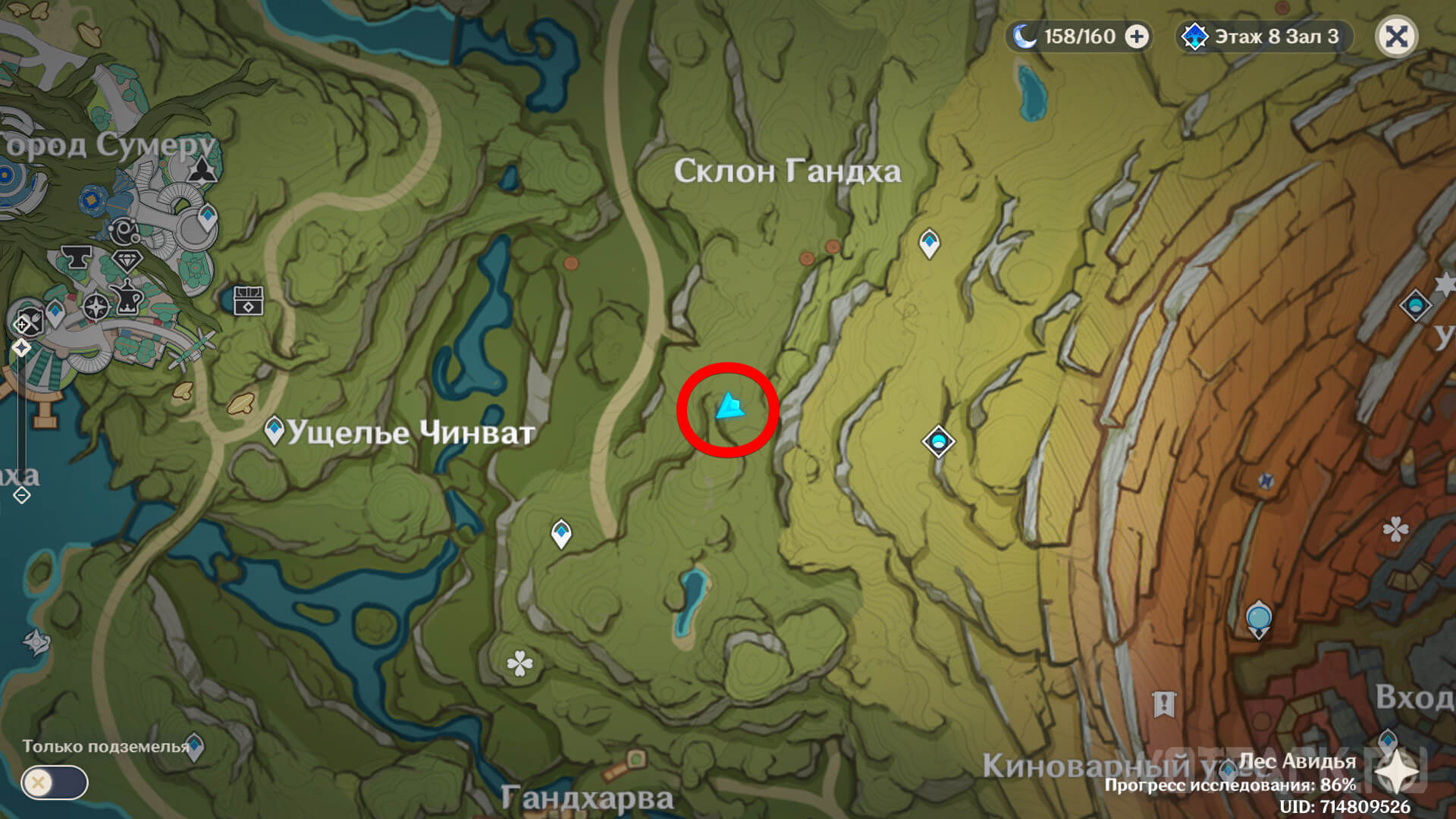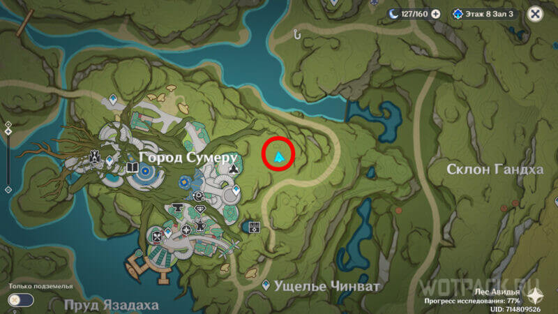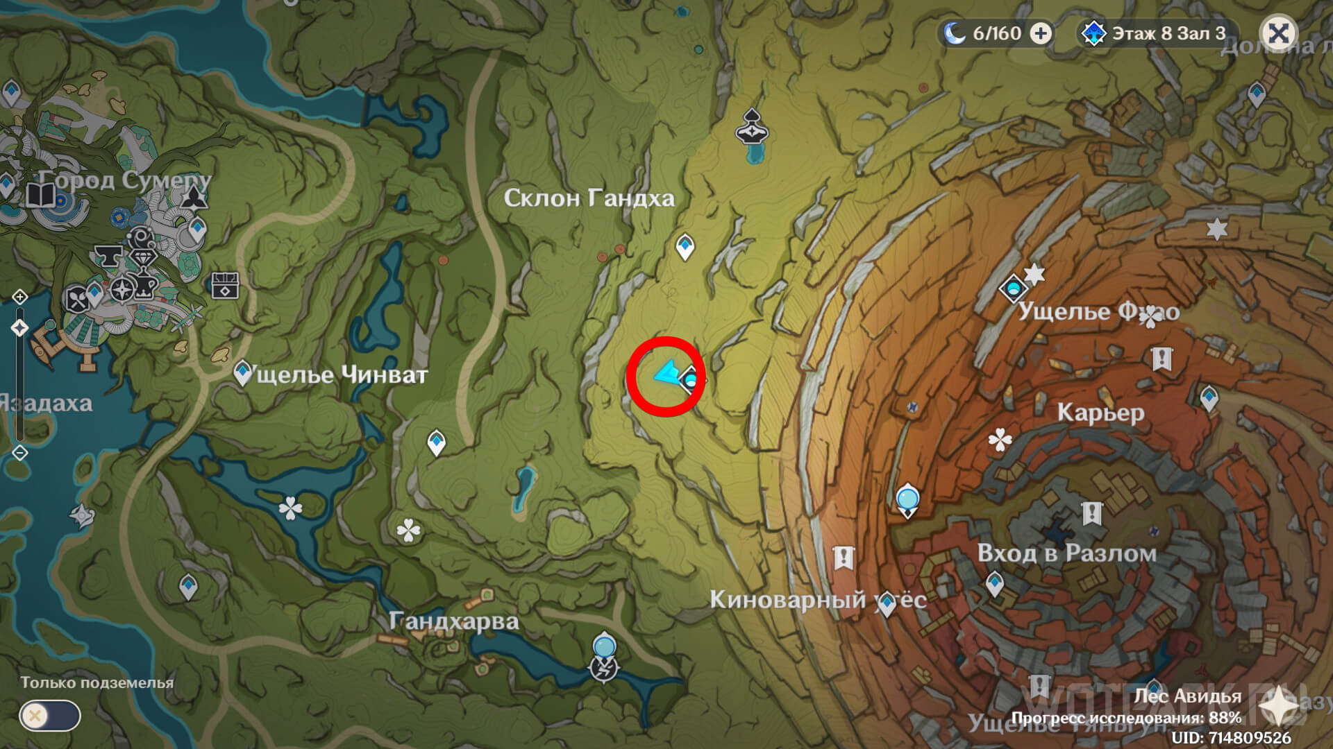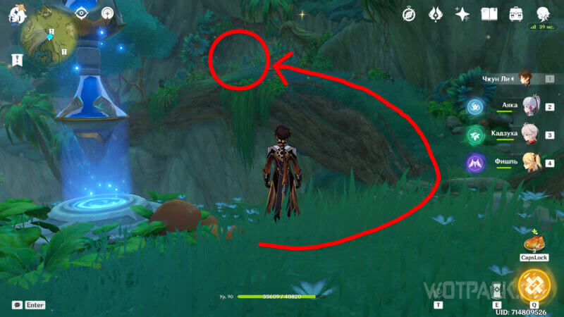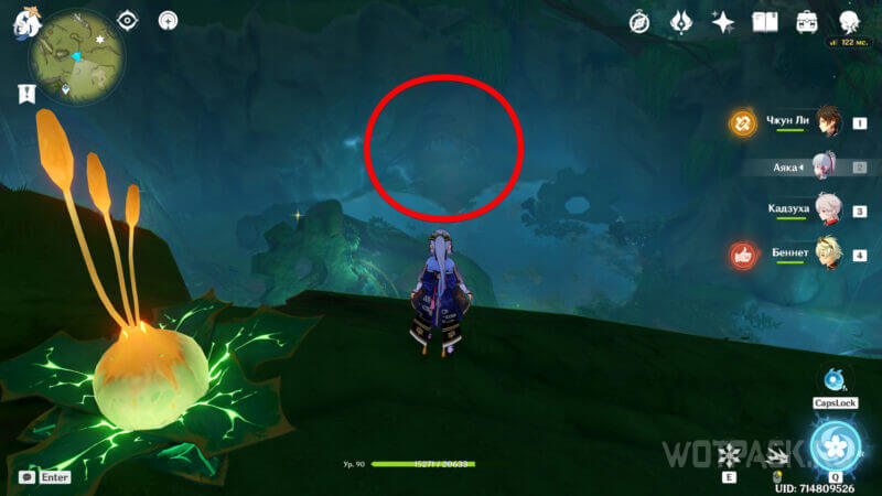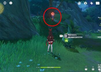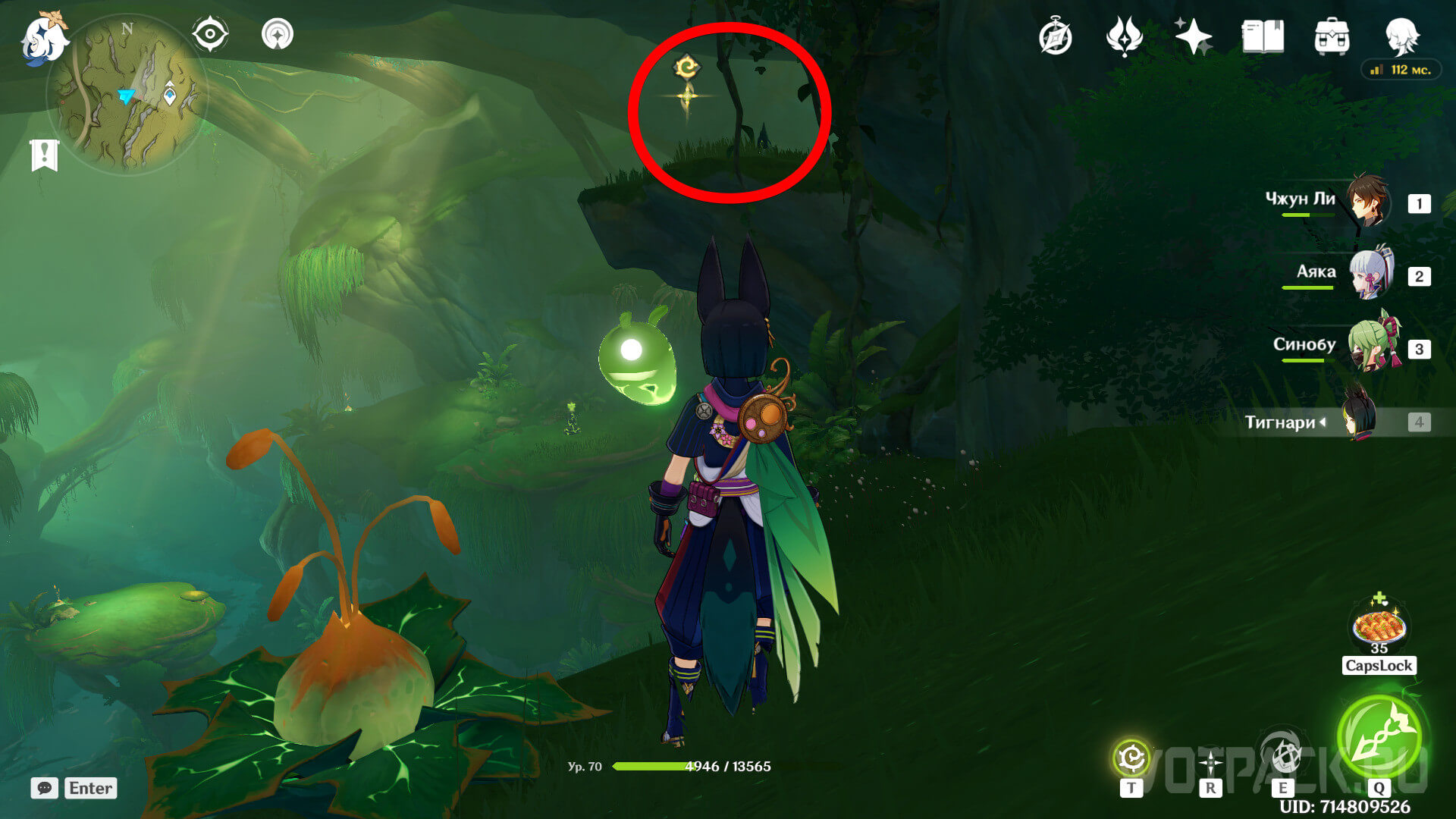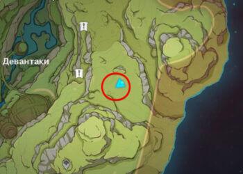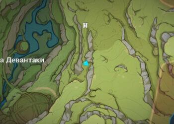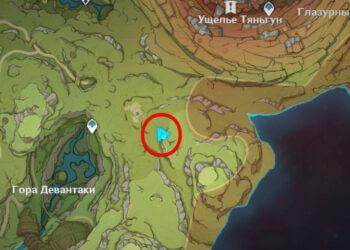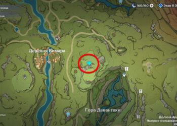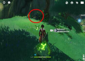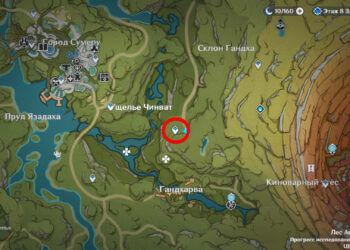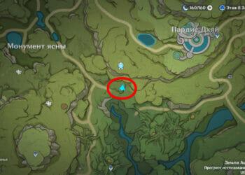 Телепортируйтесь к месту, указанному на скриншоте. Пройдите вправо от телепорта, там будет первая загадка этого ущелья. Призовите дендрогранумы и выстрелите по Дендро мишени.