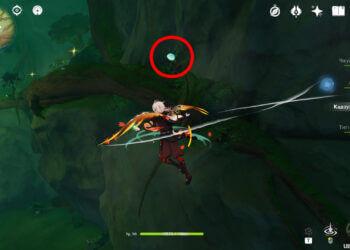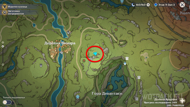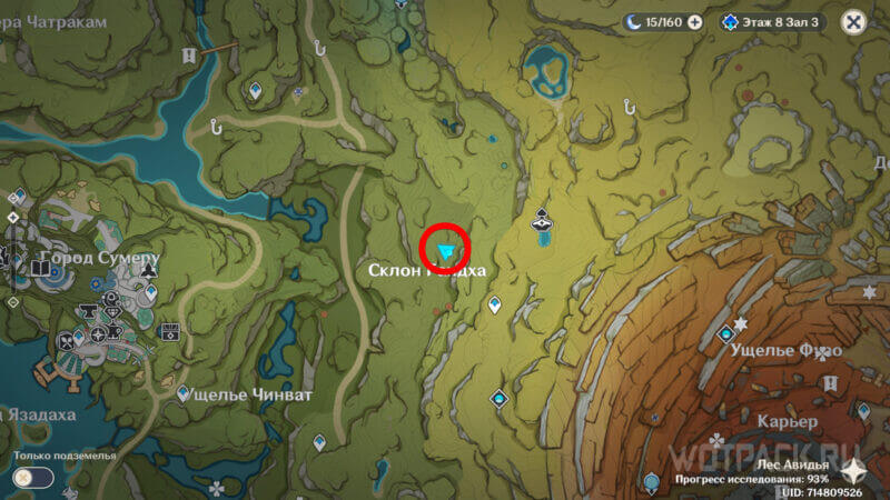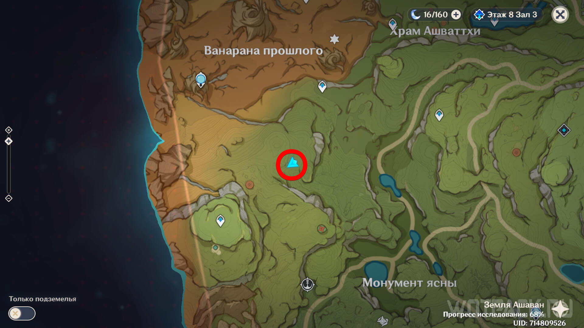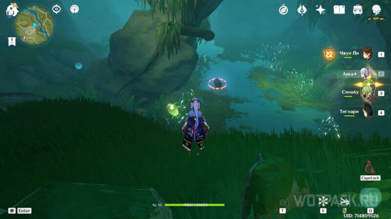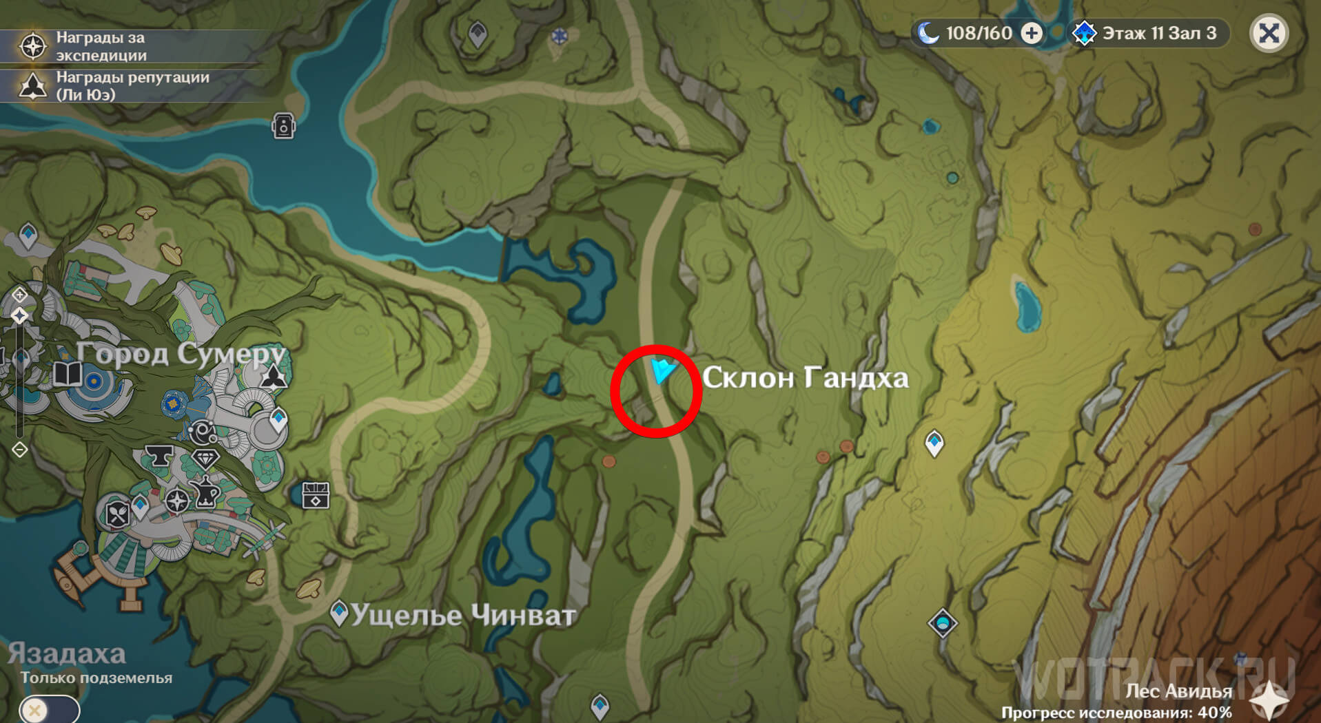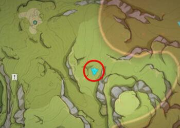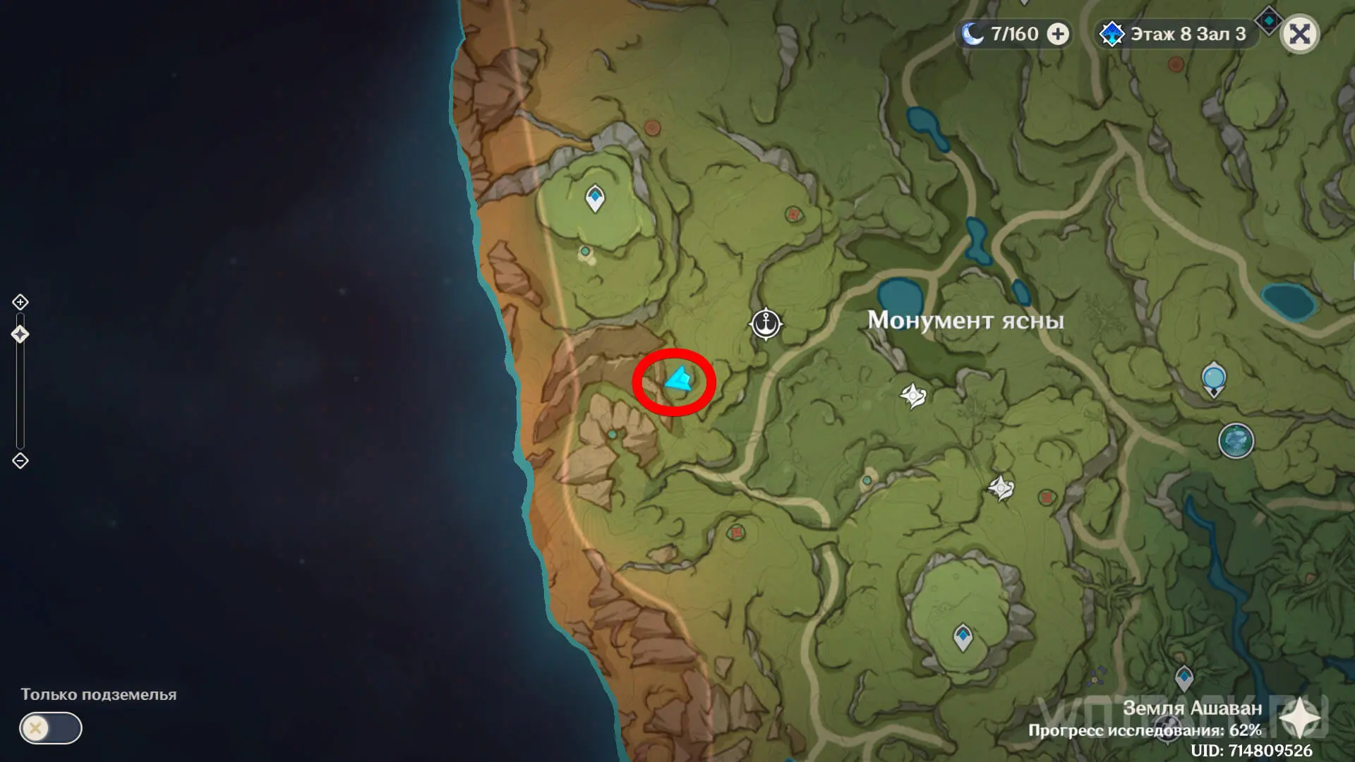 Телепортируйтесь к месту, указанному на скриншоте. Пройдите вправо от телепорта, там будет первая загадка этого ущелья. Призовите дендрогранумы и выстрелите по Дендро мишени.