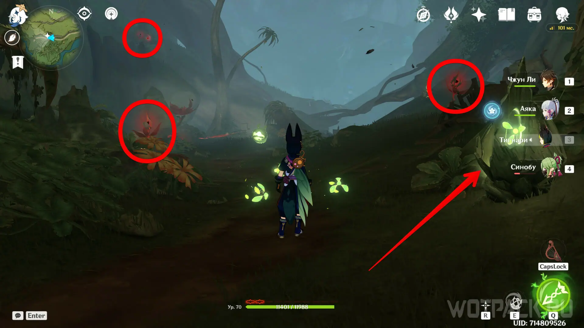 Призовите дендрогранумы и убейте плесенников, используя стихию дендро (это уменьшит их защиту). Чтобы избавиться от Увядания, снова возьмите дендрогранумы и ударьте заряженными или прицельными атаками по ветвям Увядания (указаны на скриншоте). Осторожно, они взрываются! Лучше всего это делать с помощью лука, находясь на некотором расстоянии.