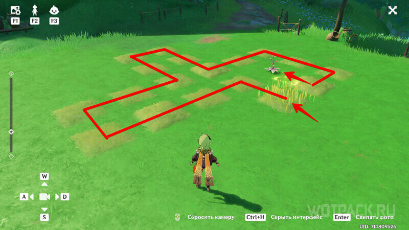 Если посмотреть на четырехлистный символ на некотором расстоянии, над ним загорится небольшой круглый знак в виде закрученной веточки. Нажмите «T» чтобы подлететь к цветку, затем наведите камеру на следующий и снова используйте «T».