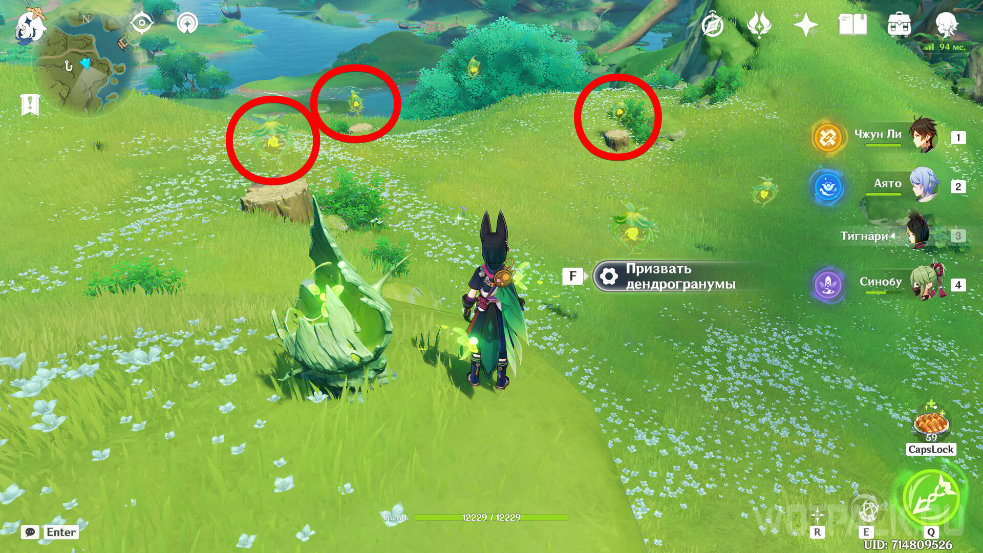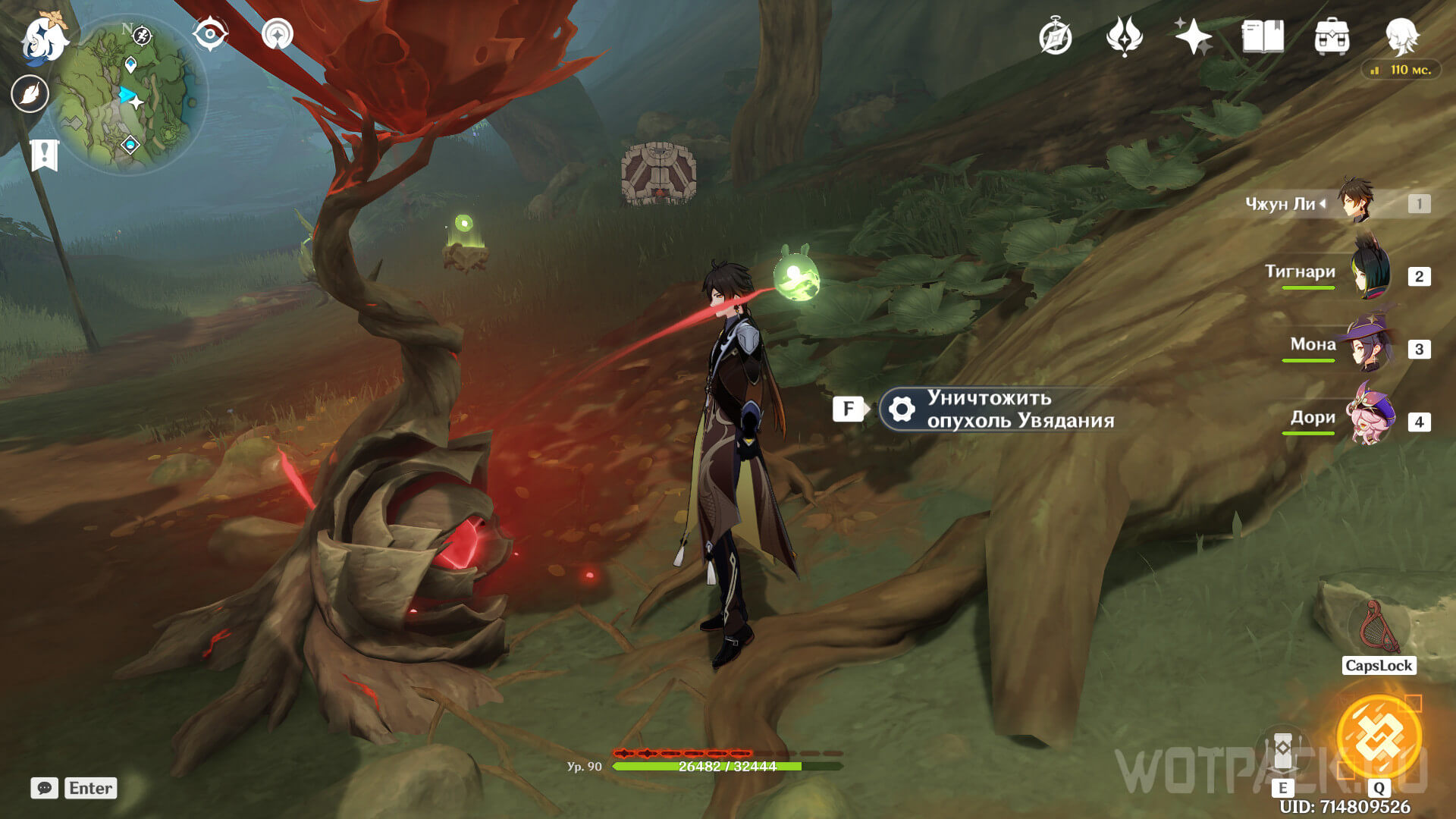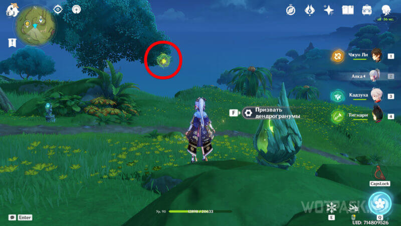 Призовите Дендрогранумы (указаны на скриншоте стрелкой) и избавьтесь от ветвей Увядания. Далее разберитесь со всеми врагами, используя Дендро персонажей и уничтожьте опухоль Увядания. Награда: богатый сундук.