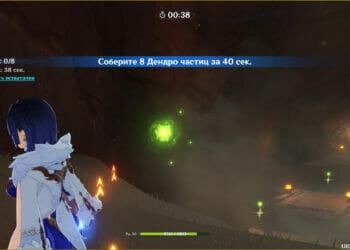 Вернитесь к тропе, ведущей к верхней части зала. Справа от дороги (напротив, если идти от палатки) расположено испытание на время. Необходимо собрать 8 Дендро частиц за 40 секунд.