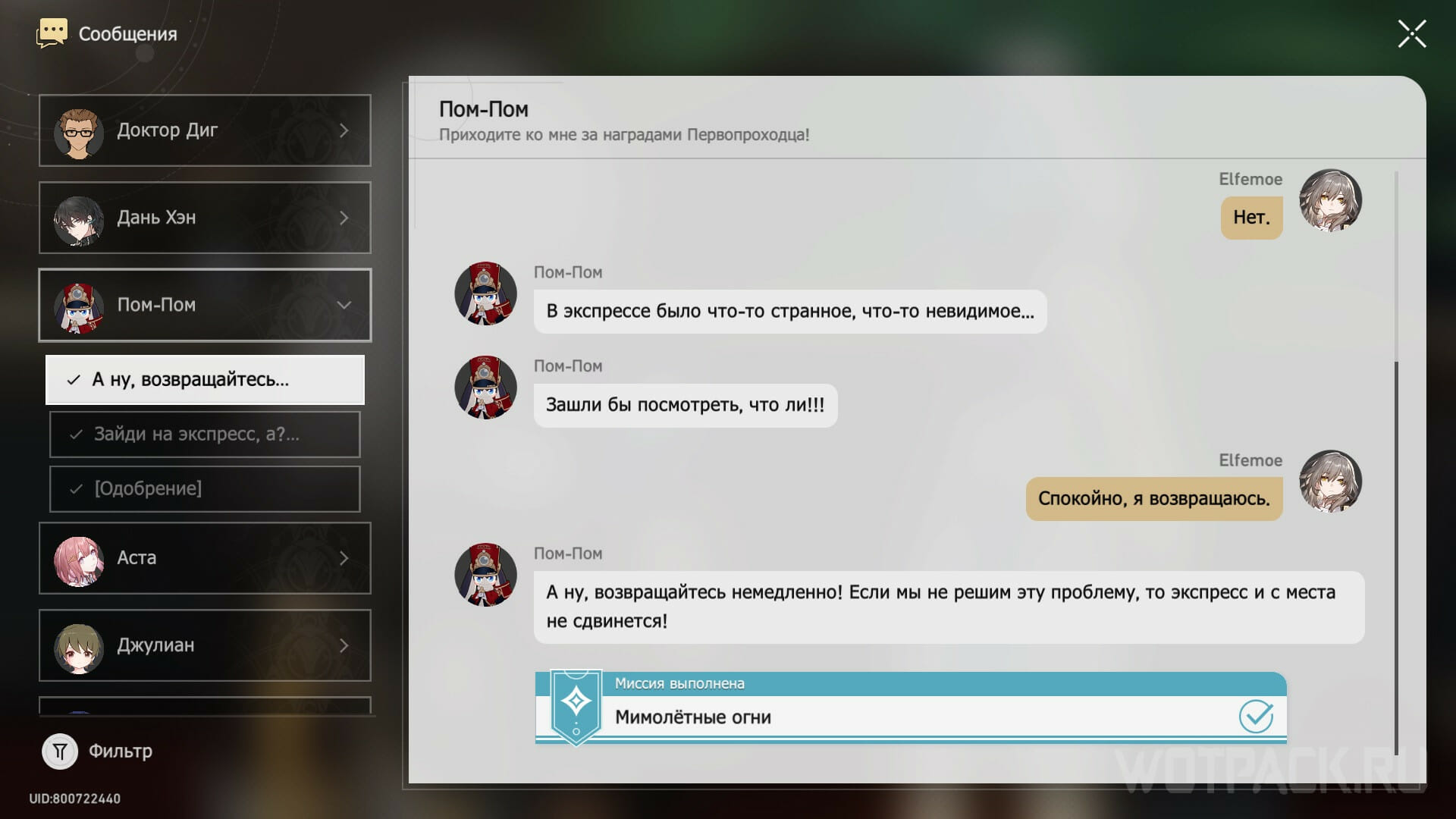 - пройти миссию «Мимолетные огни» от Пом-Пом, в ходе которой придется разузнать, что за невидимое существо поселилось на территории экспресса.