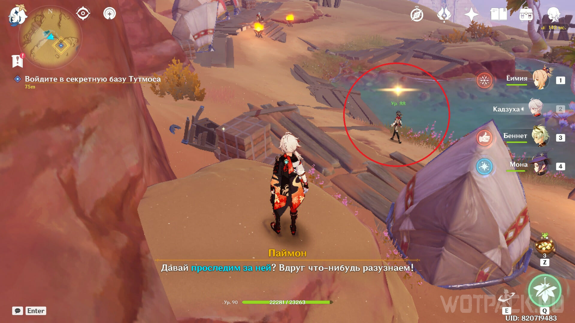 Как только окажетесь в зоне задания, начнется новый этап квеста. Среди находящихся рядом с базой Пустынников найдите девушку-наемницу и начинайте за ней слежку.