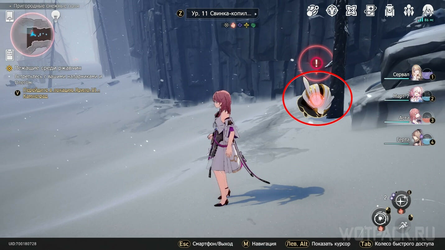Хотя сама свинка не дает нужных ресурсов, с ней в команде присутствуют Тени вечнозимья, с которых и выпадают материалы. Как и в случае с мобами, охраняющими сундуки, это одноразово. То есть впоследствии фармить спот не получится. Отправляйтесь к пространственному якорю на западе локации Пригородные снежные поля и идите прямо. Справа возле камней и дерева появится черно-белый зверек с золотыми ушами. Начните атаковать его, чтобы приступить к бою.