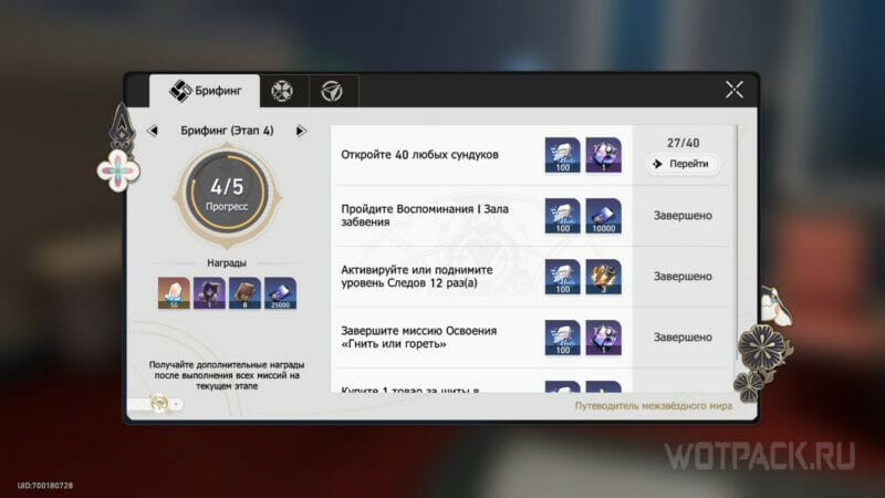 Брифинг – список задач из «Путеводителя межзвездного мира». Данная система связана с изучением ключевых игровых механик: достижение определенного уровня, прохождение сюжета, сражение с монстрами, прокачка персонажей, исследование мира и так далее. Рекомендуется выполнять каждый этап и заполнять прогресс, чтобы заработать Звездные нефриты и другие бонусы.